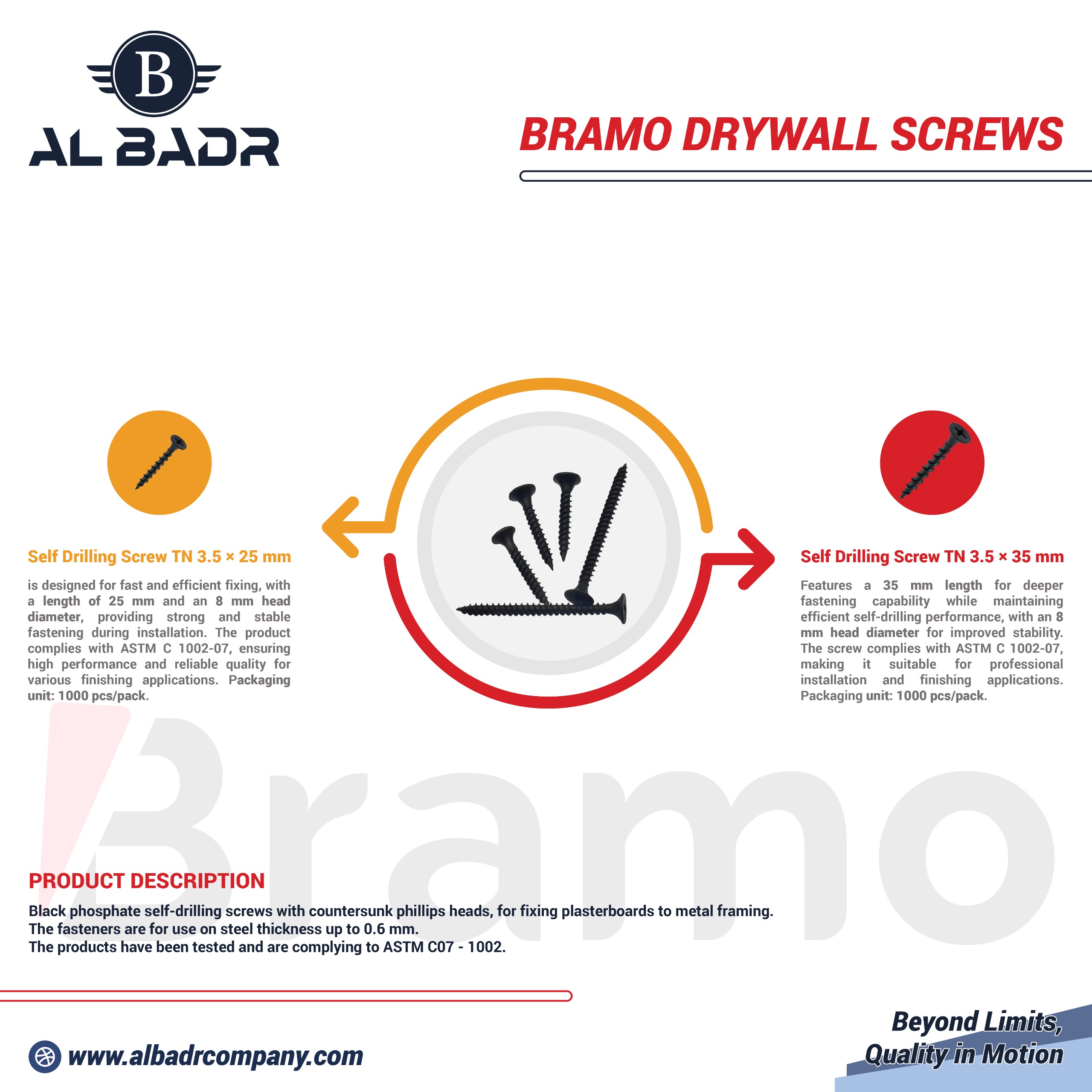 Bramo screws in sizes 25 and 35, manufactured with Chinese quality and modern production technology through integrated manufacturing stages to deliver the ideal and expected performance. They feature outstanding properties such as heat resistance during high-speed rotation and friction, as well as fast drilling capability.